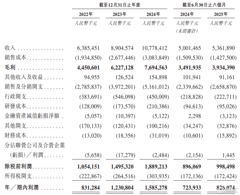 具体来看,2022年、2023年、2024年及2025年上半年,珀莱雅的收入分别约63.85亿元、89.05亿元、107.78亿元、53.62亿元,毛利率分别为69.7%、69.9%、71.4%、73.4%,对应的净利润分别约8.31亿元、12.31亿元、15.85亿元、8.26亿元。