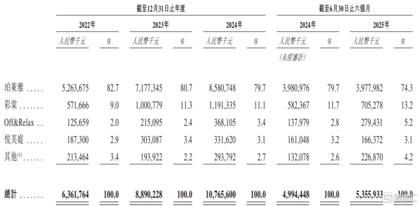 按品牌划分,2022年至2025年上半年(简称“报告期”),珀莱雅品牌为公司贡献了70%以上的收入,占比较大;彩棠、off&relax等子品牌的收入占比有所提升,但占比相对较低。