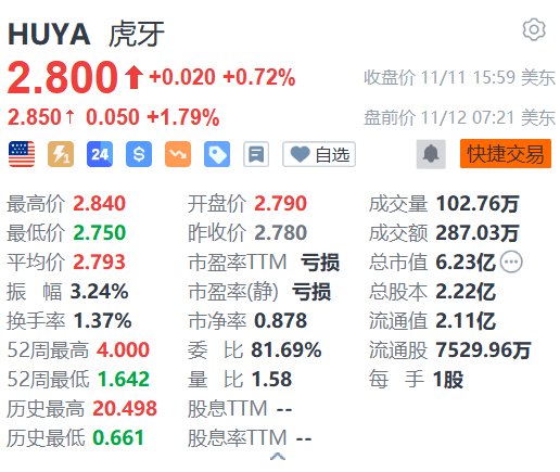 虎牙(HUYA.US)盘前涨1.79%报2.85美元。消息面上,三季度虎牙公司总收入达16.9亿元,创近九个季度以来新高,同比增速提升至约10%。其中,直播收入企稳回升,达11.6亿元;游戏相关服务、广告和其他业务保持快速增长,该板块收入同比上涨约30%至5.3亿元,占总收入比例提高至31.5%。在非美国通用会计准则(Non-GAAP)下,该季度公司实现运营利润630万元,归属于虎牙公司的净利润3630万元。用户数据方面,2025年第三季度,虎牙总MAU达到1.62亿。(格隆汇)