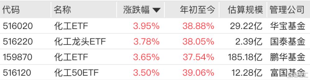 化工板块持续上攻,新宙邦涨超17%,恩捷股份、天赐材料涨停,多氟多涨超9%,化工ETF、化工龙头ETF、化工50ETF涨超3.5%,年内涨幅38%。