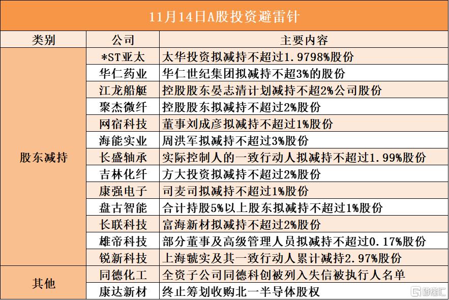 华仁药业股东华仁世纪集团拟减持不超3%的股份;江龙船艇控股股东晏志清计划减持不超2%公司股份;聚杰微纤控股股东拟减持不超过2%股份;长盛轴承实际控制人的一致行动人拟减持不超过1.99%股份;康强电子股东司麦司拟减持不超过1%股份;长联科技股东富海新材拟减持不超过2%股份;锐新科技股东上海虢实及其一致行动人累计减持2.97%股份;同德化工全资子公司同德科创被列入失信被执行人名单;康达新材终止筹划收购北一半导体股权