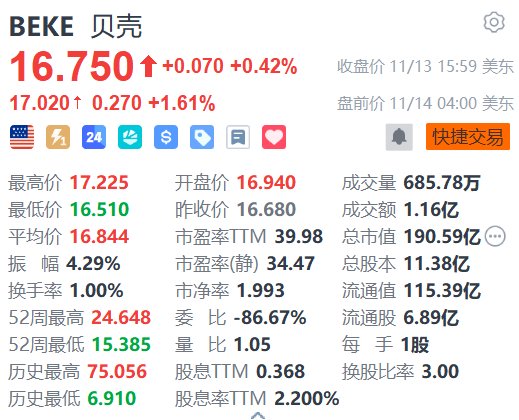 贝壳(BEKE.US)盘前涨1.61%,报17.02美元。消息面上,美银证券发研报指,贝壳第三季营收为231亿元,按年增长2%,符合市场共识;调整后净利润13亿元,优于预期;家居装修与租赁业务均开始产生显著利润。因第三季业绩优于预期及第四季预测上调,该行将其美股目标价从19美元上调至20美元,重申“买入”评级。
