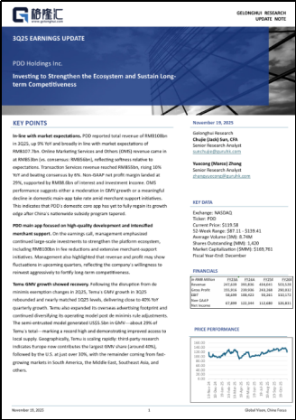 格隆汇中概研究院发布拼多多(PDD.US) 3Q25更新报告《Investing to Strengthen the Ecosystem and Sustain Long-term Competitiveness》。公司于 2025 年 11 月 18 日美股盘前发布 2025 财年第三季度业绩。拼多多本季度实现总收入人民币 1080 亿元,同比增长 9%,基本符合市场预期的人民币 1077 亿元。广告(在线营销服务及其他)收入为人民币 530 亿元(市场一致预期为 560 亿元,略低于预期),交易服务收入达人民币 550 亿元,同比增长 10%,高于一致预期的 6%。非美国会计准则口径下,公司净利润率为 29%,主要得益于第三季度人民币 86 亿元的利息和投资收益。