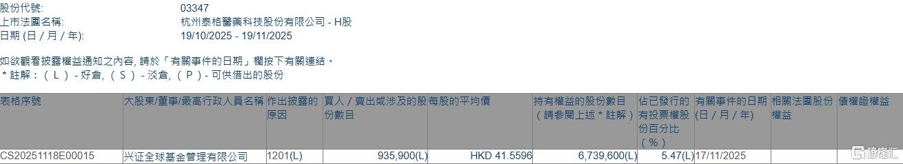 消息面上,联交所最新权益披露资料显示,泰格医药于11月17日遭兴证全球基金管理有限公司在场内以每股均价41.5596港元减持93.59万股,涉资约3889.56万港元。减持后,其最新持股数目为673.96万股,持股比例由6.23%下降至5.47%。(格隆汇)