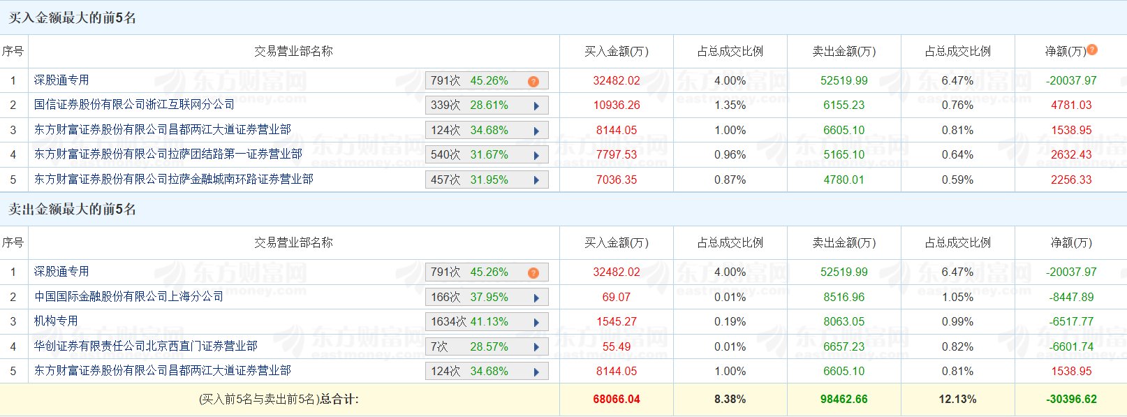 多氟多(002407.SZ)今日跌停,换手率20.64%,成交额81.18亿元。龙虎榜数据显示,深股通买入3.24亿元,卖出5.25亿元,净卖出2亿元;游资“量化基金”位列卖二席位,净卖出8448万元。上榜席位全天买入6.81亿元,卖出9.85亿元,合计净卖出3.04亿元。(格隆汇)