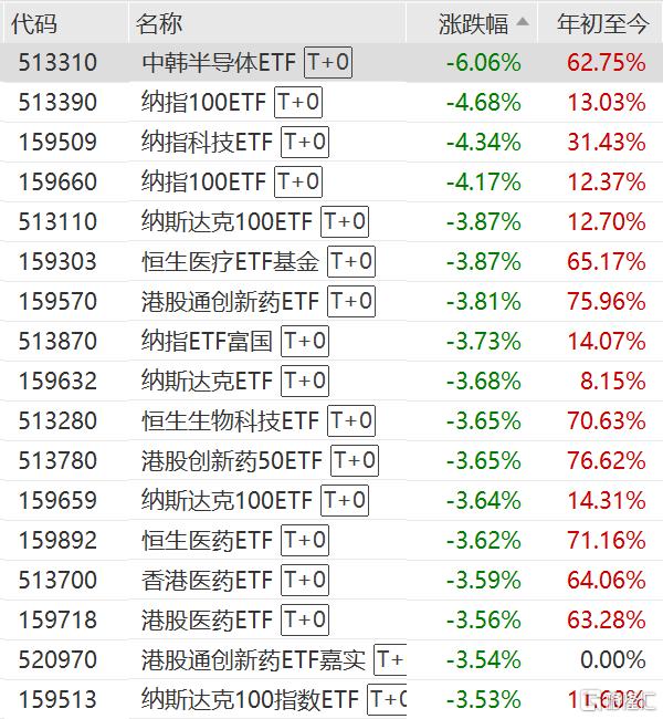 中韩半导体ETF跌超6%,纳指100ETF 、纳指科技ETF跌超4%。