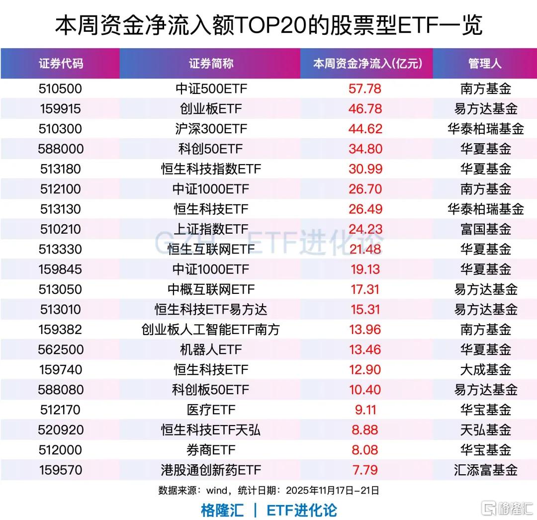 本周ETF资金累计净流入规模达701.21亿元,中证500ETF、创业板ETF、沪深300ETF、科创50ETF、恒生科技指数ETF、中证1000ETF、恒生科技ETF、上证指数ETF、恒生互联网ETF本周资金净流入居前。