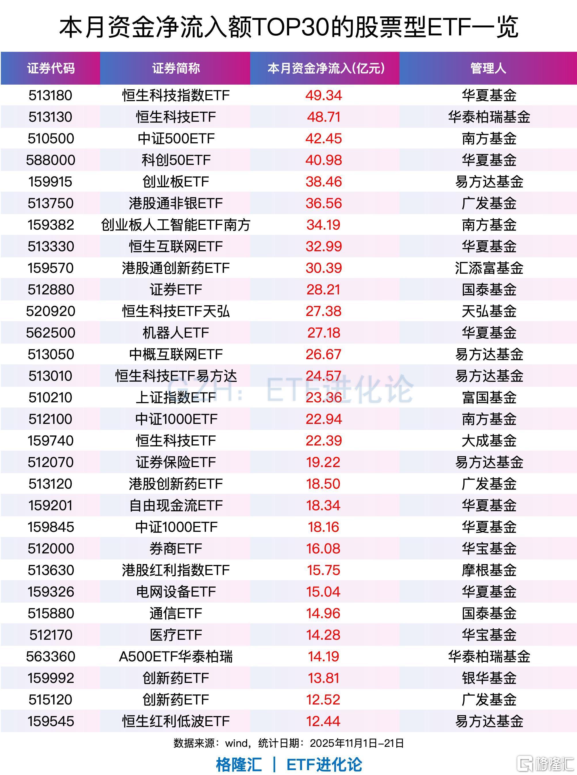 Wind数据显示,港股通非银ETF、证券ETF、证券保险ETF、自由现金流ETF、券商ETF、港股红利指数ETF、电网设备ETF等本月均获超15亿元的资金净流入。