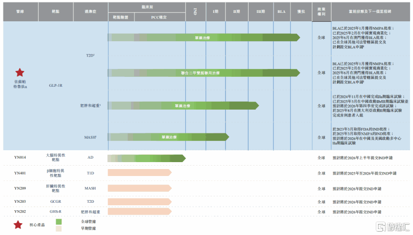 此外,针对MASH的YN209(肝脏特异性靶点)、针对T2D的YN203(GCGR靶点)及针对肥胖和超重的YN202(GHS-R靶点)均避开了当前行业扎堆的热门靶点,聚焦于“机制更精准、临床需求更迫切”的细分领域,且已同步推进至IND准备阶段,计划2026年集中提交申请。