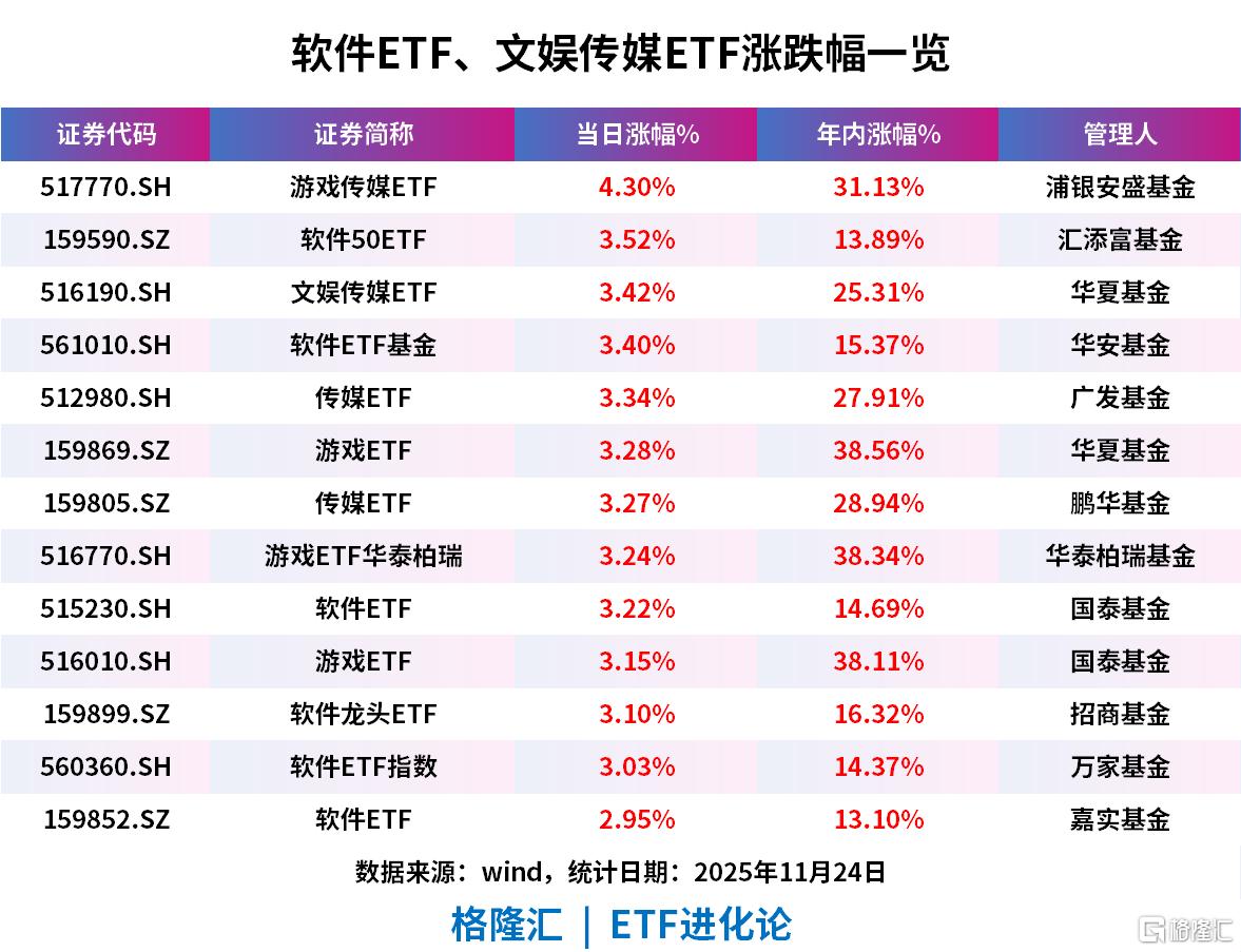 游戏传媒ETF涨超4%;软件50ETF、文娱传媒ETF、软件ETF基金、传媒ETF、游戏ETF、游戏ETF华泰柏瑞、软件ETF、软件龙头ETF、软件ETF指数涨超3%。