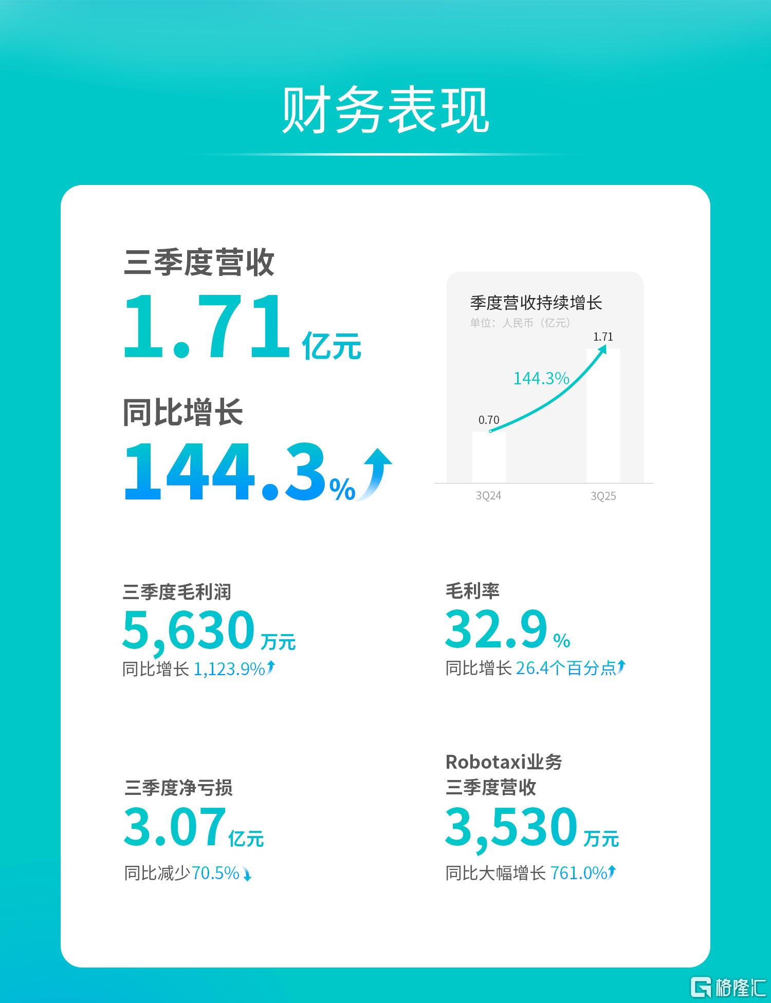 三季度,公司营收1.71亿元,同比增长144.3%,是公司成立以来涨幅最大的季度之一;Robotaxi业务营收3,530万元,同比增长761.0%,延续强劲增长势头;毛利润5,630万元,同比增长1,123.9%;毛利率32.9%,同比增长26.4个百分点,持续领跑行业;净亏损3.07亿元,同比减少70.5%。经调整后亏损(Non-IFRS net loss)2.76亿元。