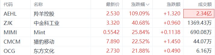 中概股收盘涨幅居前的个股为:羚羊控股涨109.09%,中金科工业涨40.68%,Mint涨25.84%,猎豹移动涨22.52%,东方文化涨21.88%。(格隆汇)