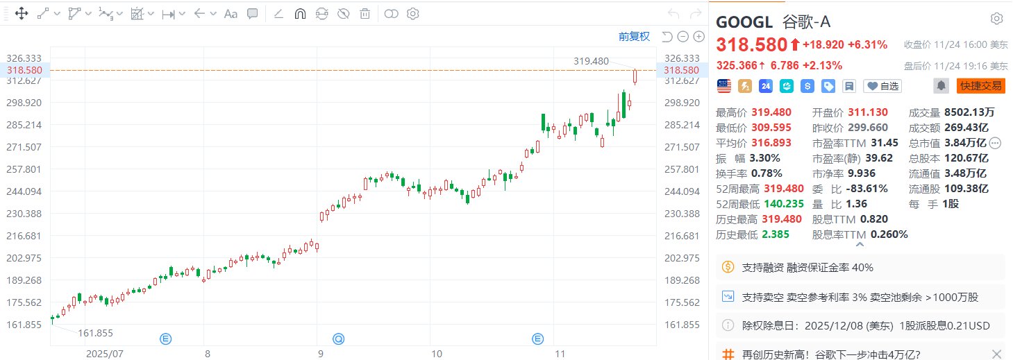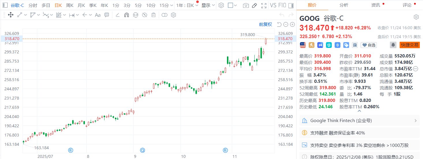 谷歌(GOOG.US,GOOGL.US)收盘均涨超6%,分别报318.58美元、318.47美元。消息面上,谷歌母公司Alphabet正与Meta等公司洽谈,拟向其开放自研Tensor AI芯片使用权,进一步拓展与英伟达的竞争格局。谷歌传统上仅将自研的TPU部署于自有数据中心并向客户出租算力。但美国科技媒体The Information在当地时间周一晚间称,谷歌现计划直接向客户销售TPU芯片供其部署于自有数据中心。Meta正考虑自2027年起采购价值数十亿美元的谷歌TPU芯片用于其数据中心,同时拟最早于2026年开始向谷歌云租用TPU算力。而目前Meta的AI业务主要依赖英伟达GPU。这对共同设计Tensor芯片的谷歌与博通而言,意味着一个潜力巨大的新兴市场。同时或将形成对英伟达和AMD的重大竞争压力,可能冲击后者的销售额与定价权。