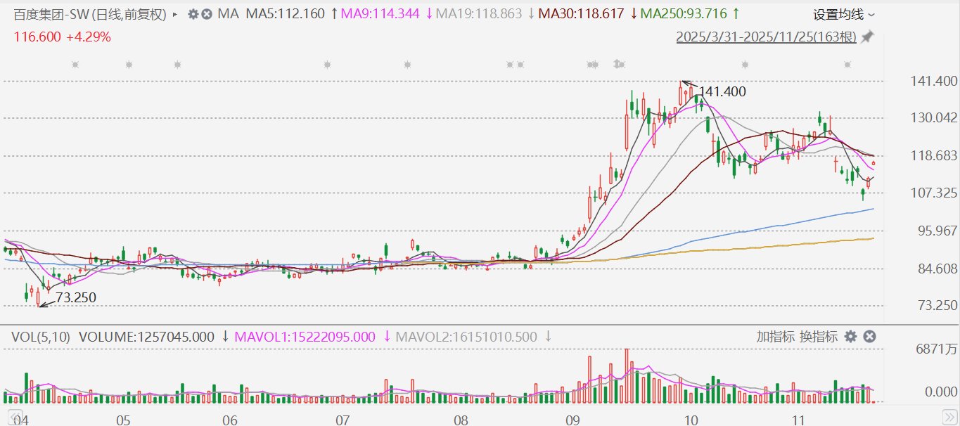 百度集团-SW(9888.HK)涨超4%报116.6港元。隔夜美股市场百度收涨超7%报119.21美元,折算成港股市场价格为116.17港元/股。