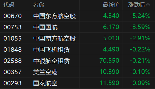 港股航空股持续弱势,中国东方航空跌超5%,市值失守千亿港元大关,中国国航跌3.6%,中国南方航空跌近3%,美兰空港、国泰航空均飘绿。