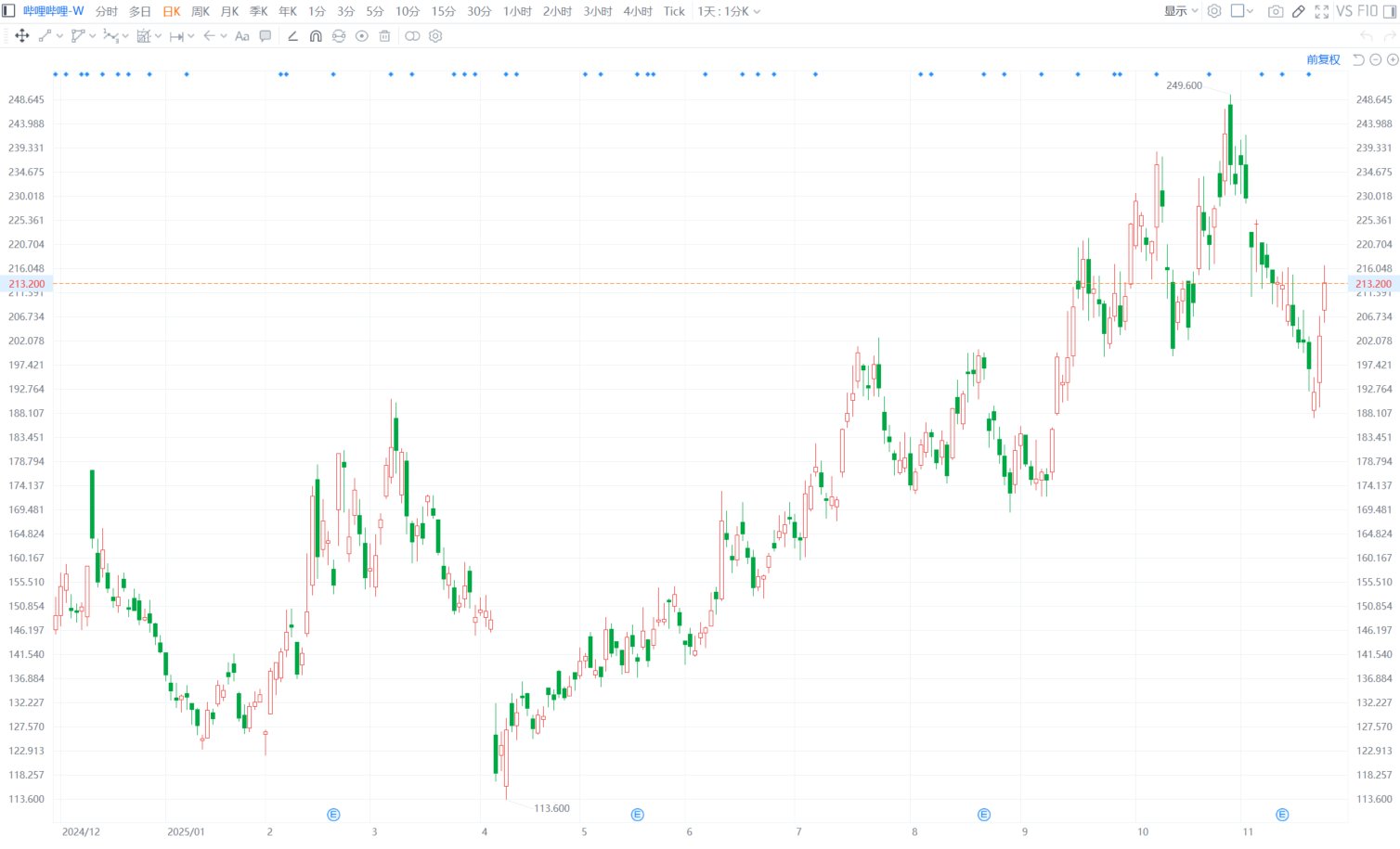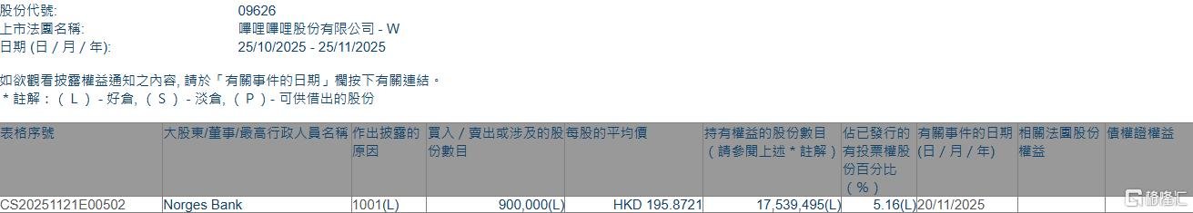 昨日收涨5.67%的哔哩哔哩-W(9626.HK)今日继续走高,盘中一度涨6.7%至216.6港元,年内已累涨超52%。联交所最新权益披露资料显示,哔哩哔哩-W于11月20日获Norges Bank在场内以每股均价195.8721港元增持90万股,涉资约1.76亿港元。增持后,其最新持股数目为1753.95万股,持股比例由4.89%上升至5.16%。