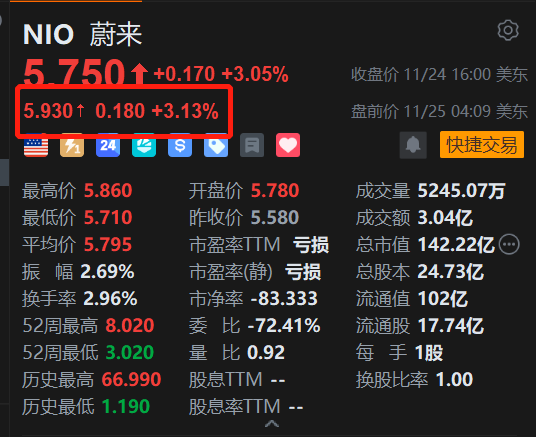 蔚来(NIO.US)美股盘前继续上涨超3%。消息上,蔚来即将发布第三季度财报。有机构预测公司Q3营业收入223.15~223.86亿元,同比增长19.5%~19.9%。另外,吞武里集团拓展与蔚来合作,乐道和萤火虫品牌将引入泰国市场。