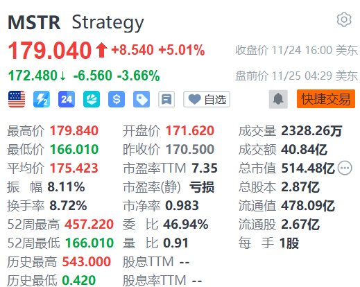 比特币财库公司Strategy(MSTR.US)盘前跌3.6%报172.48美元。消息面上,标普道琼斯指数公司周一晚间宣布,计算机存储设备制造商Sandisk Corp.将于11月28日正式加入标普500指数。Sandisk击败了Strategy,后者近期刚获得入选标普500指数的资格。