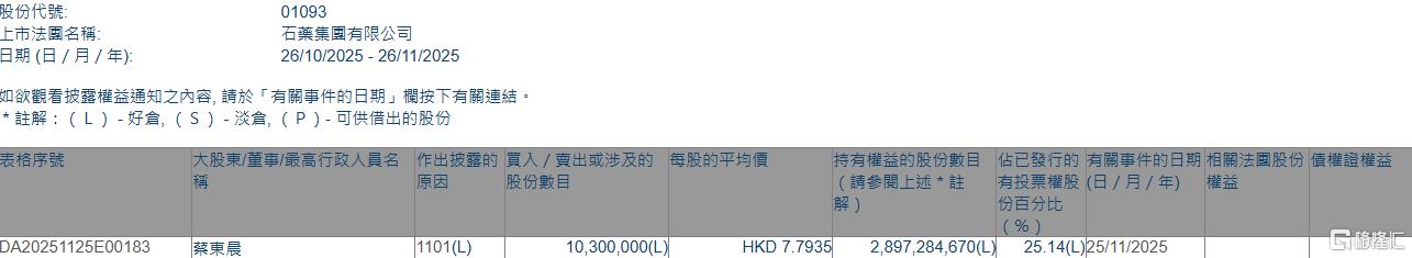 格隆汇11月26日丨根据联交所最新权益披露资料显示,2025年11月25日,石药集团(01093.HK)获执行董事兼主席蔡东晨在场内以每股均价7.7935港元增持1030万股,涉资约8027.31万港元。