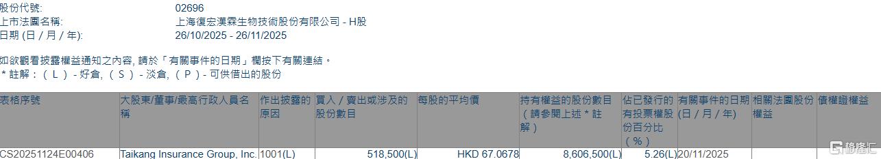 格隆汇11月26日丨根据联交所最新权益披露资料显示,2025年11月20日,复宏汉霖(02696.HK)获Taikang Insurance Group, Inc.在场内以每股均价67.0678港元增持51.85万股,涉资约3477.5万港元。