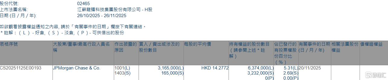 格隆汇11月26日丨根据联交所最新权益披露资料显示,2025年11月20日,龙蟠科技(02465.HK)获JPMorgan Chase & Co.以每股均价14.2772港元增持好仓316.5万股,涉资约4518.73万港元。