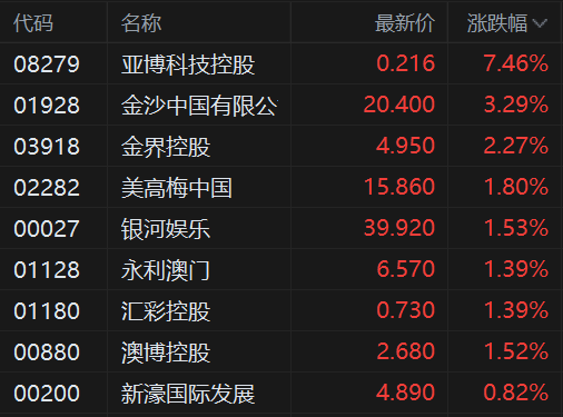 港股濠赌股盘初集体拉升上涨,其中,亚博科技控股涨超7%领衔,金沙中国涨3.3%,金界控股涨2.2%,美高梅中国涨近2%,银河娱乐、永利澳门、澳博控股、汇彩控股均涨超1%。