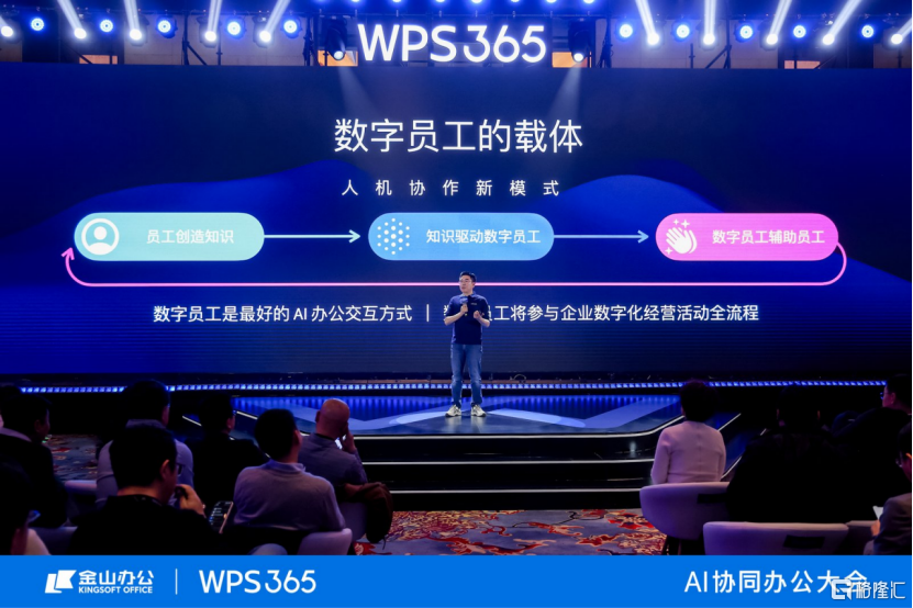在知识的应用方面,他认为未来的协同办公软件是“数字员工的载体”。他指出,WPS 365将打造“人机协同”的全新办公模式:员工在工作中创造有价值的知识,WPS 365基于这些知识,构建数字员工。反过来,数字员工将参与企业数字化全流程,进一步为企业创造价值,从而形成“员工创造知识——知识驱动数字员工——数字员工辅助和反哺员工”的正向循环。
