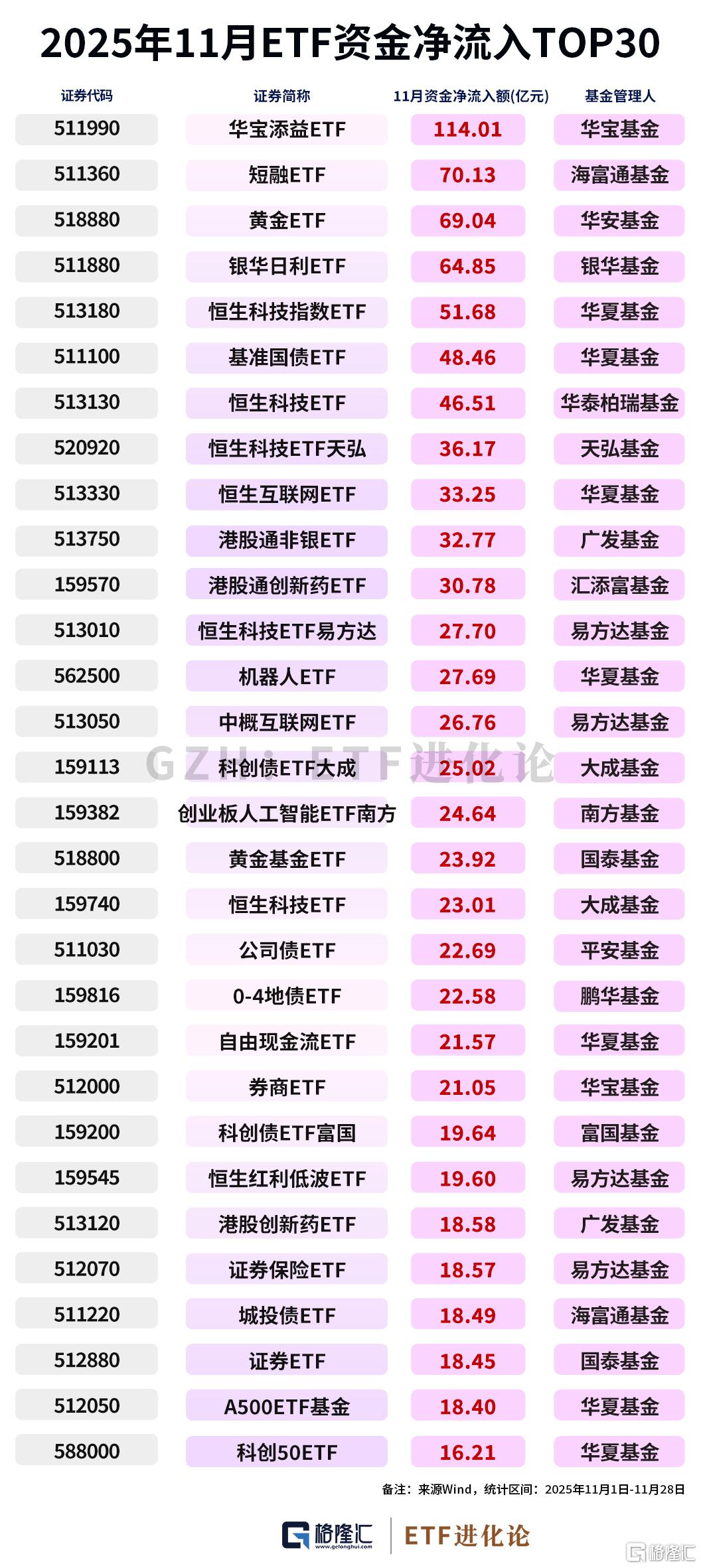 11月单月资金流向榜单,揭示出投资者在年末的谨慎心态。华宝添益ETF净流入114亿元,短融ETF净流入70亿元,银华日利ETF净流入64亿元,货币基金、债券基金成为资金“避风港”。