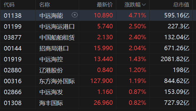 港股港口及海运股普遍上涨,其中,中远海能涨超5%,中远海运港口、中国船舶租赁涨2.5%,招商局港口、中远海控、东方海外国际、中远海发、海丰国际跟涨。