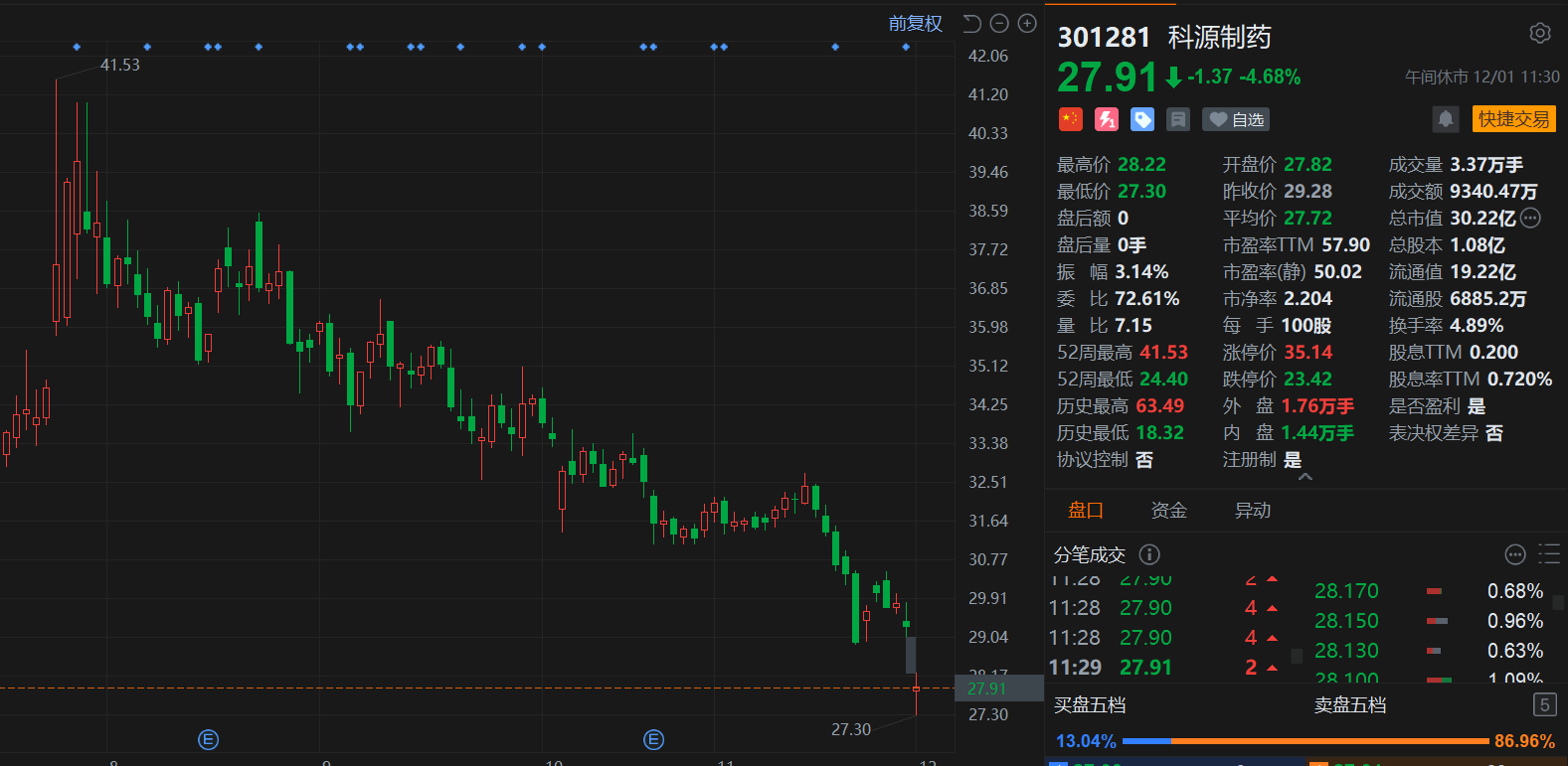 科源制药(301281.SZ)跳空低开,盘中一度跌近7%,低见27.3元刷新阶段新低,总市值30.22亿元。消息上,科源制药上周五晚发布公告,公司董事会已审议通过终止发行股份购买资产及募集配套资金事项,同时撤回相关申请文件。公司表示,终止系因市场环境变化,为维护全体股东长期利益作出的审慎决策,一个月内不再筹划重大资产重组。业绩方面,今年前三季度营业收入3.03亿元,同比下降8.5%;归母净利润3147万元,同比下降20.7%。